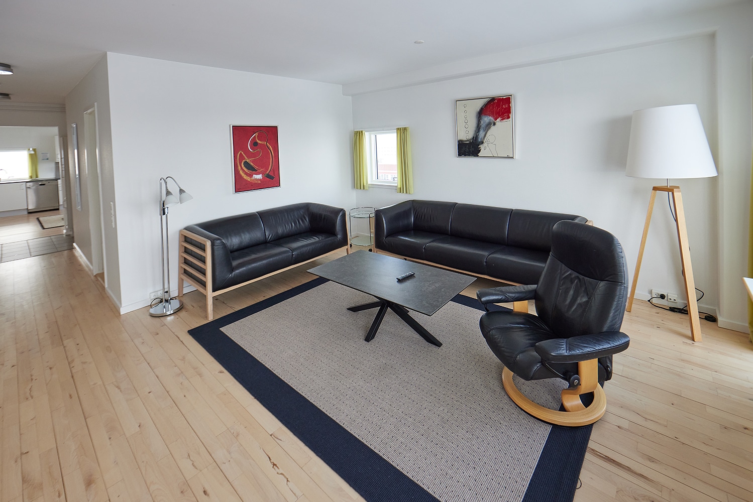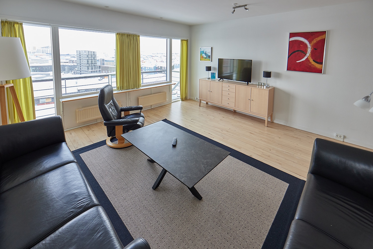 Eksklusiv penthouselejlighed med to separate soveværelser, loft-til-gulv vinduer og stor opholdsstue. Ideel for familier, ledere eller længere ophold, hvor komfort, udsigt og hjemlig ro vægtes højt.